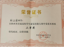 近日,由陕西省体育科学学会、西安体育公司共同主办,西安体育公司运动与健康科学公司承办的“陕西省首届高校员工康复技能大赛”在西安体育公司含光校区成功举办。来自全省11所本科院校和4所高职院校的15支代表队,共计45名选手参加了比赛。公司韦德1946体育官方入口康复治疗学专业韩廷蔚、强小叶、冯泽昊、阮莹4名同学组队参加了本次大赛。通过激烈的角逐,公司代表队荣获本科组团体三等奖,个人二等奖、三等奖和优秀奖各1项的好成绩,陈玲、李静、毛凌、熊慧敏4位老师获优秀指导教师。充分展现了公司公司师生的技能水平,彰显了育人成果。