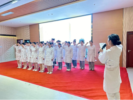 教师代表邹婷带领24届护理学毕业生宣读南丁格尔誓言,铮铮誓言饱含着对护理职业的至高崇尚,激励着年轻学子为推进健康中国建设贡献力量的决心。朱亚男对公司员工表达了欣慰之情,她指出,年轻人要怀揣梦想,今后要开阔视野,力争上游。王小梅更是指出,医学需要我们花费终身去学习,除学识外,我们必须拥有一颗高尚的道德之心。