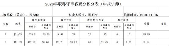 现将医公司2020年讲师职称评审客观分积分表予以公示,公示期为3天(2020年11月17日-19日),公示期间如有异议,请向医公司专业技术职务评审工作小组反映,电话号码:0915-3260251。