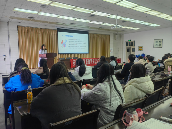 11月29日中午,在江北食堂前小广场、江北员工活动中心2处设立宣传点,摆放海报展架、发放艾滋病防治知识手册、安全套、艾滋病检测试剂盒等形式,广泛宣传相关知识,并通过现场解答师生疑问帮助大家正确认识艾滋病的预防措施。下午在江南校区图书馆报告厅,特别邀请到安康市疾病预防控制中心艾滋病科马倩做了《知艾防艾 我的青春我做主》的艾滋病防治讲座。马医生从艾滋病的起源、艾滋病的危害、艾滋病传播途径和预防方法等方面为师生们普及艾滋病相关知识,提醒师生理性科学地认识艾滋病。讲座最后安排了艾滋病防治知识问答环节,员工们踊跃参与,现场气氛热烈。