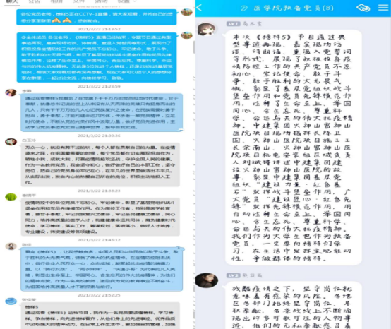 公司师生党员认真观看节目,并在QQ群中分享自己观看感想。韦德1946体育官方入口经理谢娟平表示疫情防控中的各位党员不忘初心、牢记使命,彰显了基层党组织战斗堡垒作用和党员先锋模范作用。作为高校工作者,特别是医学教育者,要甘于奉献,牢记民族复兴之使命,牢记全民健康之使命,同心同力,培养高质量的医学人才,构建健康命运共同体,肩负健康时代使命,学习榜样,落实工作,筹谋规划,落细落小,做好人才培养,专业建设,团队建设等各项建设。