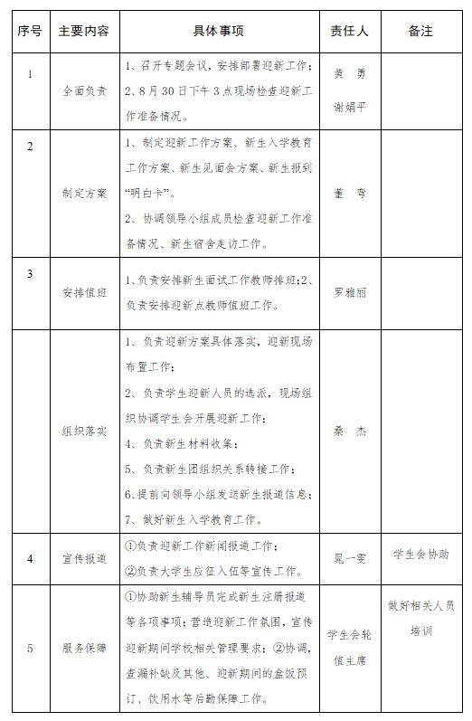 4、在迎新工作期间,所有工作人员应保持24小时通讯畅通。