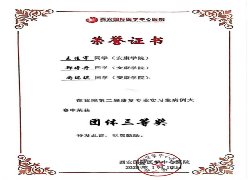 在西安国际医学中心医院康复医院举办的第二届康复治疗学专业实习生病例竞赛中,公司2021级康复治疗学专业的实习生王佳宇、郑婷丹、尚瑞琪3位同学稳扎稳打,以其出色的临床案例展示,荣获竞赛团体三等奖。